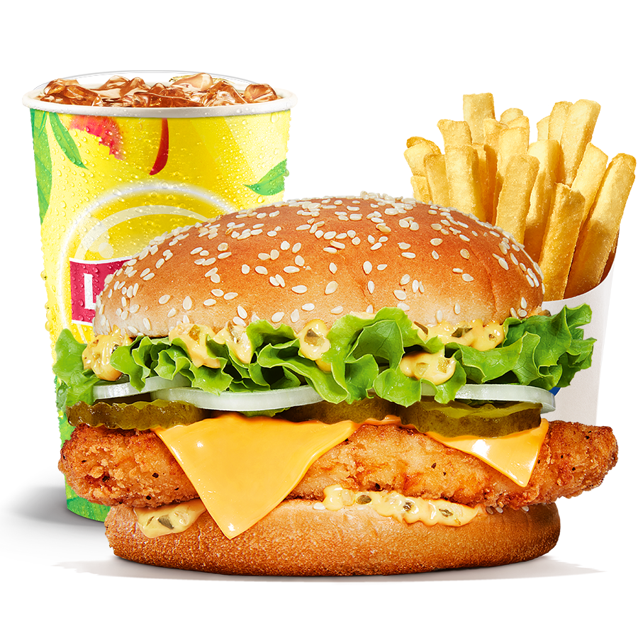 Un pain aux graines de sésames, des Onion Rings, des cornichons, de la salade, des oignons frais, des tranches de bacon fumé, des tranches de cheddar fondu, une viande de bœuf grillée à la flamme et une irrésistible sauce Big King épicée !