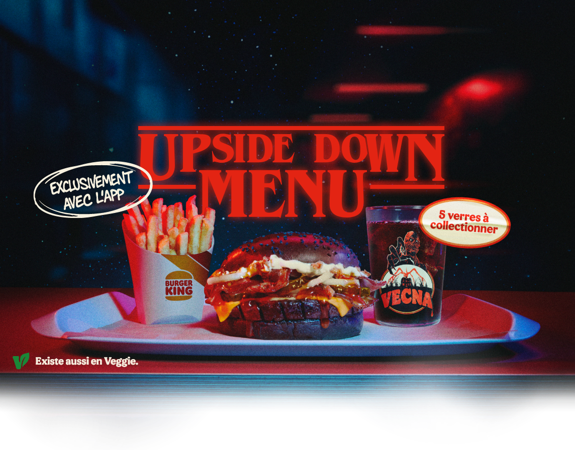 Disponibles du 25/11/2025 au 05/01/2026 inclus dans les restaurants participants et sous réserve de disponibilité, comprenant un verre parmi 5 à collectionner. Verres non vendus séparément. Offre Upside Down disponible exclusivement sur l’application Burger King France (dans la limite de 3 menus taille M, 2 menus taille L et 5 burgers Upside Down/jour/personne). Appli téléchargeable sur App Store Apple et Google Play. Voir règlement de l’opération ici.