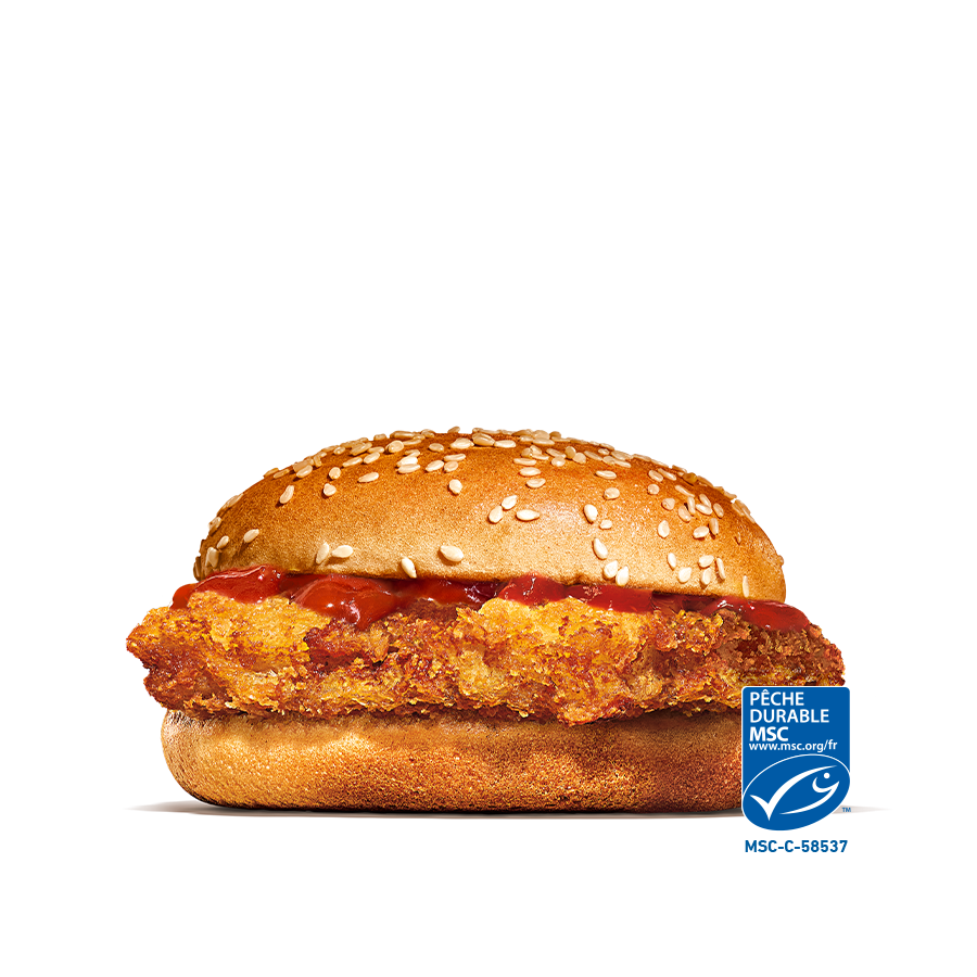 Un burger poisson spécialement conçu pour les enfants, avec du ketchup.