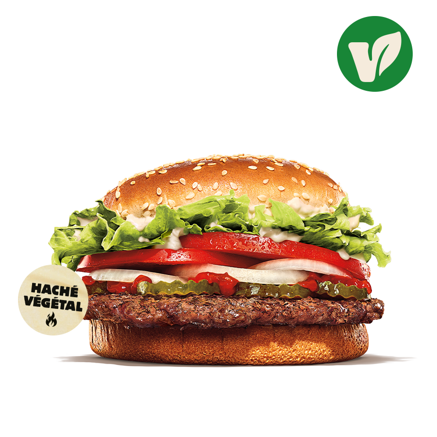 Retrouvez le mythique Whopper dans sa version veggie : un hâché végétal grillé à la flamme, une sauce onctueuse, des tomates fraîches, une salade croquante, des cornichons et des oignons. Même chaîne opératoire que les autres produits.